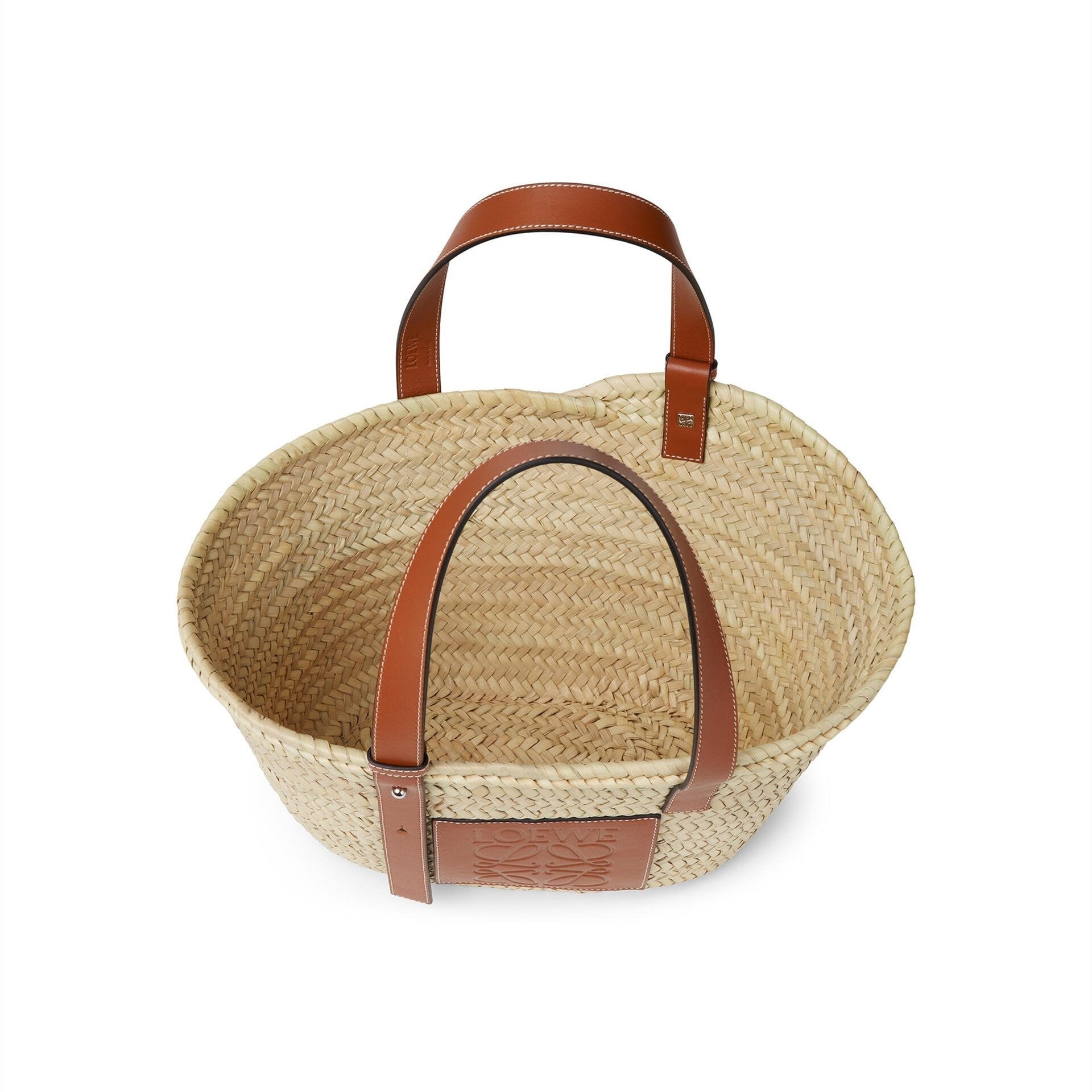 Shoulder or top handle carry Adjustable top handle Customizable with straps and personalized charms Unlined Embossed Anagram Patch Due to the nature of handmade, the sizes may vary, each with its own unique characteristics. Color: Natural/Tan Color Details: Palladium Material: Palm Leaf/Calf Handle drop: 21.5 cm Weight: 0.395 kg Height (cm): 26.5 Width (cm): 40 Depth (cm): 16